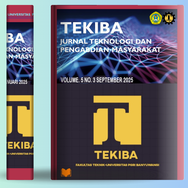 Vol. 5 No. 2 (2025)Jurnal TEKIBA: Teknologi dan Pengabdian Masyarakat adalah jurnal ilmiah multidisiplin yang diterbitkan oleh Fakultas Teknik Universitas PGRI Banyuwangi. Jurnal ini berkaitan tentang informasi gagasan, implementasi serta pencapaian dari kegiatan Pengabdian Kepada Masyarakat. Publikasi jurnal ini bertujuan untuk menyebarluaskan pemikiran atau gagasan konseptual dan hasil penelitian yang telah dicapai dalam bidang Pengabdian Kepada Masyarakat. TEKIBA merupakan jurnal Pengabdian Kepada Masyarakat dengan fokus bidang Teknologi dan Teknik Terapan diantaranya seperti Teknik Mesin, Teknik Tenaga Listrik, Teknik Kendali, Teknik Elektronika, Teknologi Informasi, Teknik Terapan dan Ilmu Teknik Lainnya yang diterbitkan secara berkala tiga kali per tahun pada bulan Januari, Mei dan September.