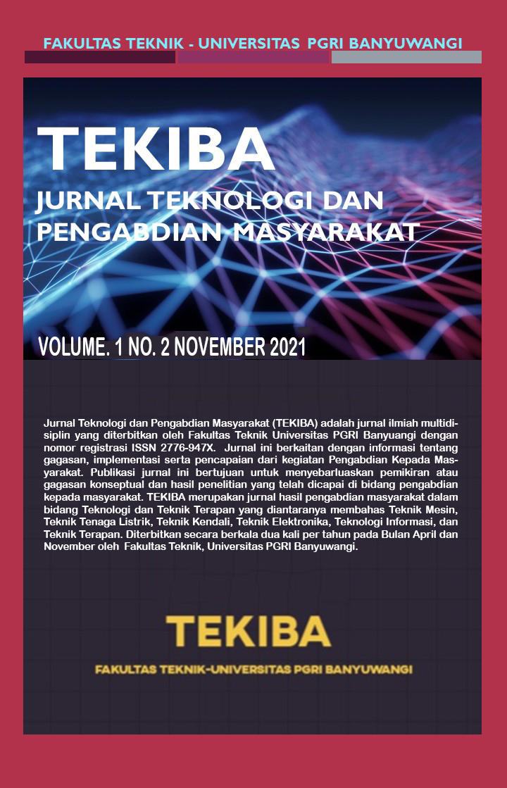 Jurnal Teknologi dan Pengabdian Masyarakat (TEKIBA) adalah jurnal ilmiah multidisiplin yang diterbitkan oleh Fakultas Teknik Universitas PGRI Banyuwangi. Jurnal ini berkaitan tentang informasi gagasan, implementasi serta pencapaian dari kegiatan Pengabdian Kepada Masyarakat. Publikasi jurnal ini bertujuan untuk menyebarluaskan pemikiran atau gagasan konseptual dan hasil penelitian yang telah dicapai dalam bidang Pengabdian Kepada Masyarakat. TEKIBA merupakan jurnal Pengabdian Kepada Masyarakat dengan fokus bidang Teknologi dan Teknik Terapan diantaranya seperti Teknik Mesin, Teknik Tenaga Listrik, Teknik Kendali, Teknik Elektronika, Teknologi Informasi, Teknik Terapan dan Ilmu Teknik Lainnya yang diterbitkan secara berkala dua kali per tahun pada Bulan April dan November oleh Fakultas Teknik, Universitas PGRI Banyuwangi.