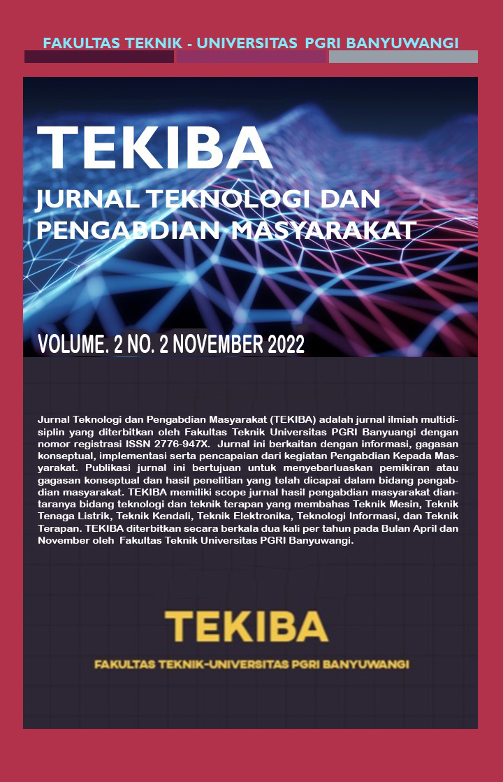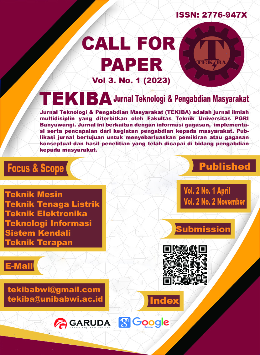 Jurnal Teknologi dan Pengabdian Masyarakat (TEKIBA) adalah jurnal ilmiah multidisiplin yang diterbitkan oleh Fakultas Teknik Universitas PGRI Banyuwangi. Jurnal ini berkaitan tentang informasi gagasan, implementasi serta pencapaian dari kegiatan Pengabdian Kepada Masyarakat. Publikasi jurnal ini bertujuan untuk menyebarluaskan pemikiran atau gagasan konseptual dan hasil penelitian yang telah dicapai dalam bidang Pengabdian Kepada Masyarakat. TEKIBA merupakan jurnal Pengabdian Kepada Masyarakat dengan fokus bidang Teknologi dan Teknik Terapan diantaranya seperti Teknik Mesin, Teknik Tenaga Listrik, Teknik Kendali, Teknik Elektronika, Teknologi Informasi, Teknik Terapan dan Ilmu Teknik Lainnya yang diterbitkan secara berkala dua kali per tahun pada Bulan April dan November oleh Fakultas Teknik, Universitas PGRI Banyuwangi.
